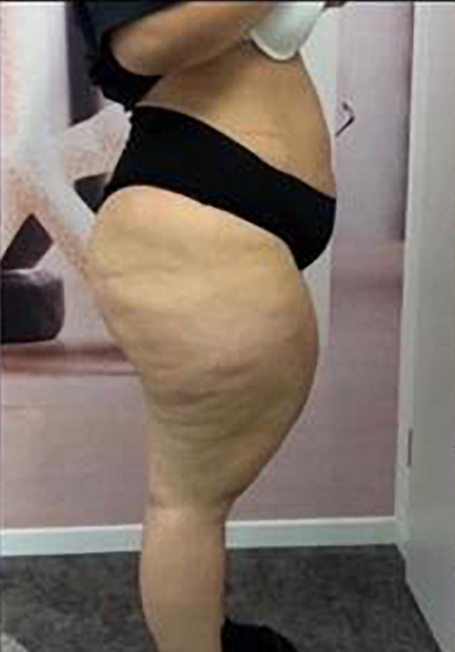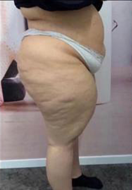Im zweiten Stadium wird die Hautoberfläche unebener und wellenartig. Größere Dellen, auch „Matratzenphänomen“ genannt, und Knötchen, die so groß wie Walnüsse oder sogar Äpfel werden können, sind typisch. Die Disproportion zwischen Rumpf und Beinen oder Armen wird deutlicher und die Fettverteilung an den unteren Extremitäten erinnert an Reiter- oder Türkenhosen.