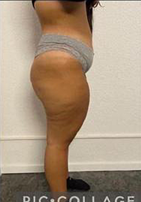 Fettansammlungen an Hüften und Gesäß.